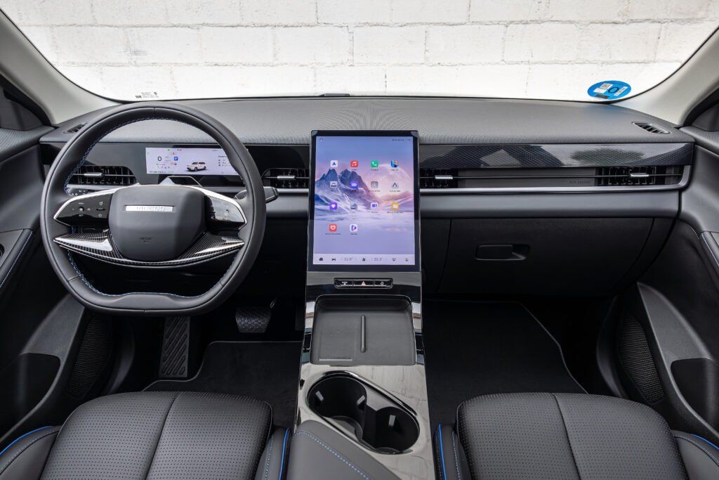 La gran pantalla táctil central vertical de 13,2 pulgadas se integra con fluidez en la consola y domina la experiencia a bordo. A ella se suma un panel digital de instrumentación de 8,88” tras el volante, que permite una lectura clara y configurable. La arquitectura electrónica, basada en el potente chip Qualcomm 8155, garantiza un sistema multimedia rápido, fluido y compatible con Apple CarPlay y Android Auto inalámbricos.