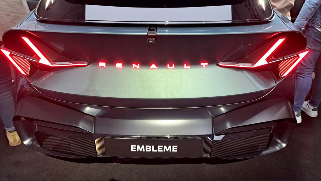 En todas sus curvas, la línea de Renault Emblème combina elegantemente las características de un coche familiar. Cuenta con una amplia distancia entre ejes (2,90 metros), con la de un coupé de altura contenida (1,52 metros) y línea de techo muy inclinada. El estilo “shooting brake” se ve realzado por un color de carrocería verde dicroico que adquiere una tonalidad diferente según el ángulo desde el que se mire.